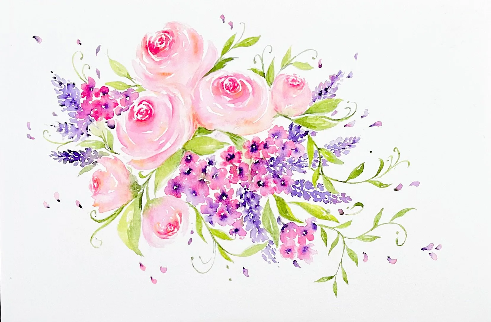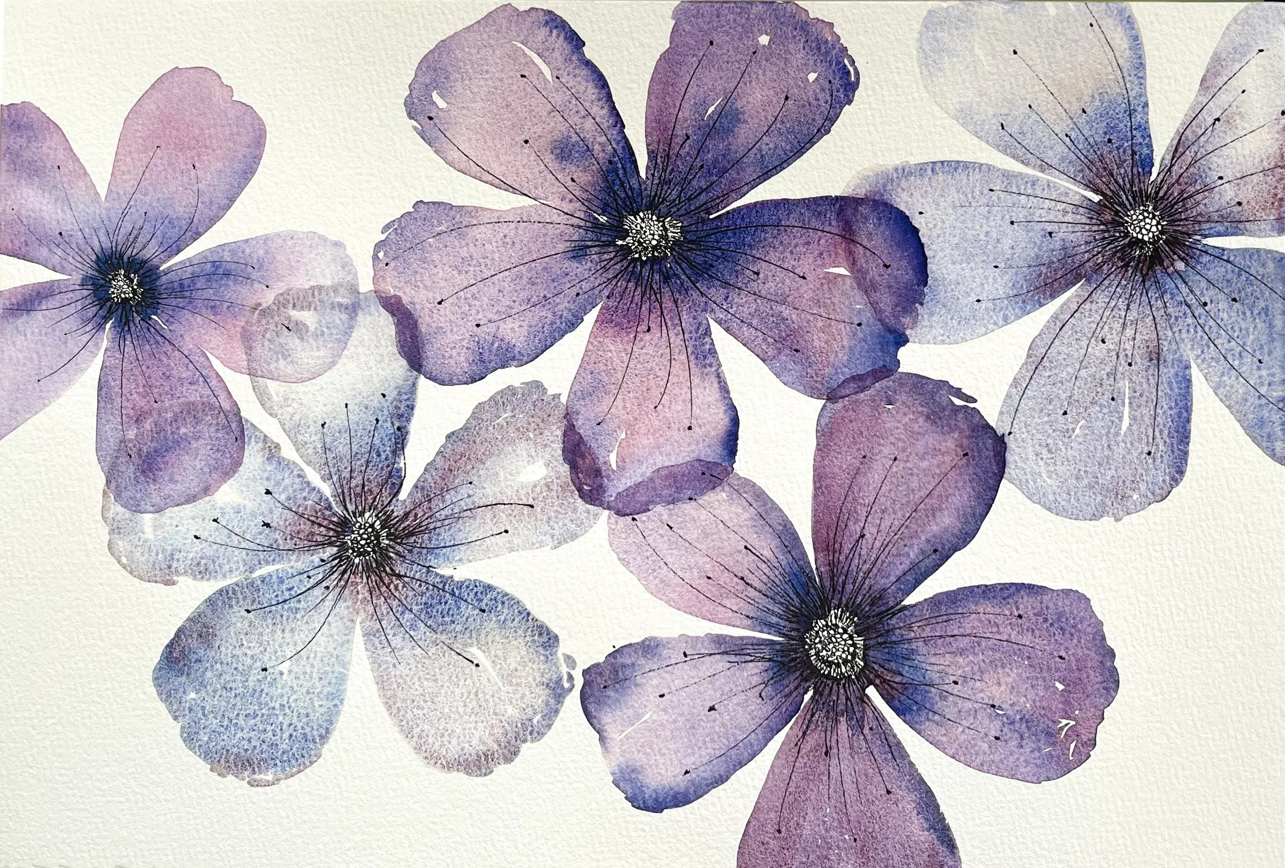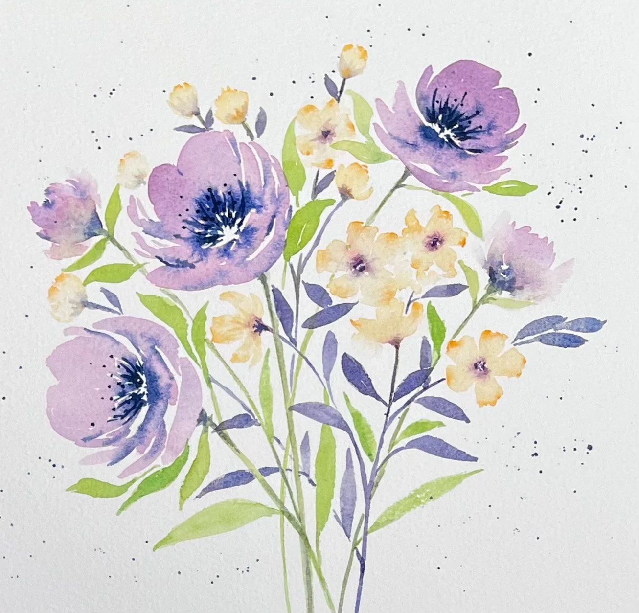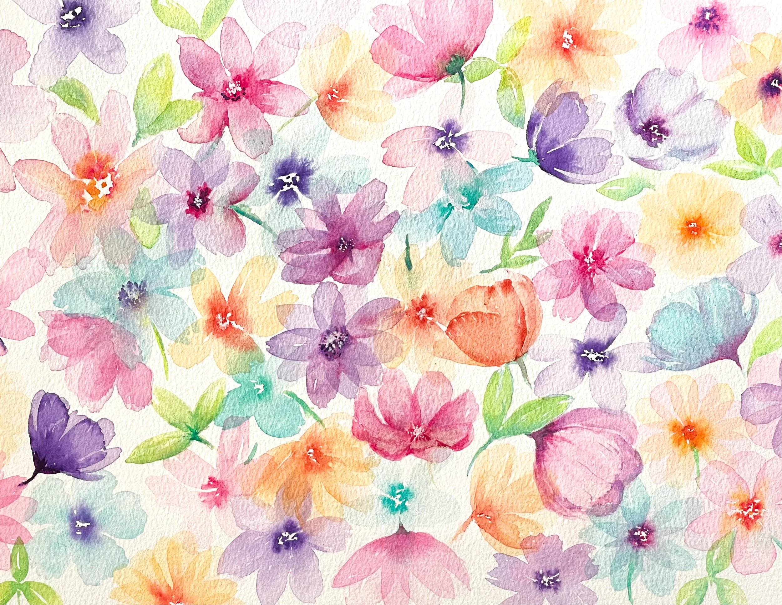 Whilst on holiday in Spain I had time to learn how to paint different flowers in watercolour. I watched a few YouTube videos then started to experiment with my brushes to see what different petal and leaf shapes they could make. This was such good fun that I thought Iād try a few floral designs when I returned home.